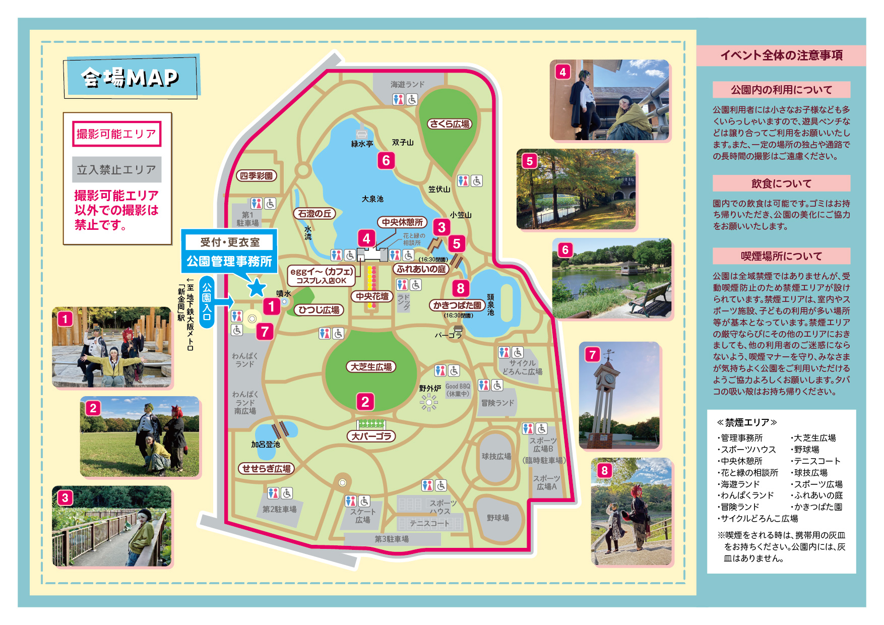 ・一定の場所での撮影は15〜20分を目安に他のお客様へお譲りください。また、長時間一定の場所で撮影をされている場合、スタッフがお声がけすることがございます。